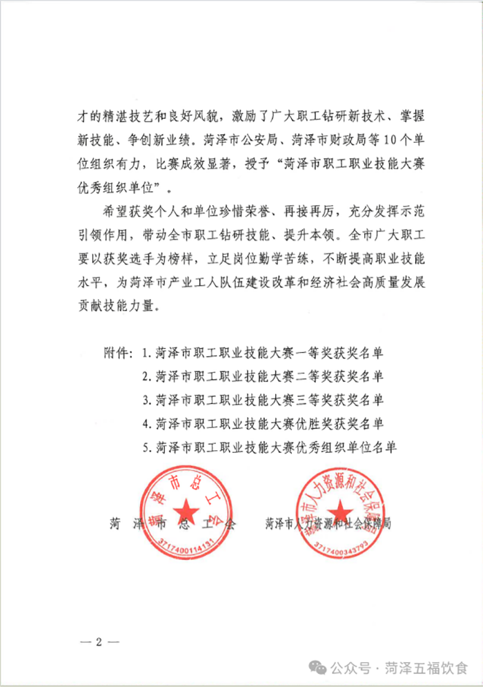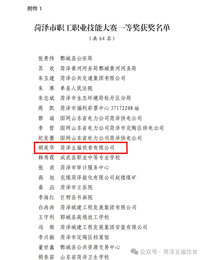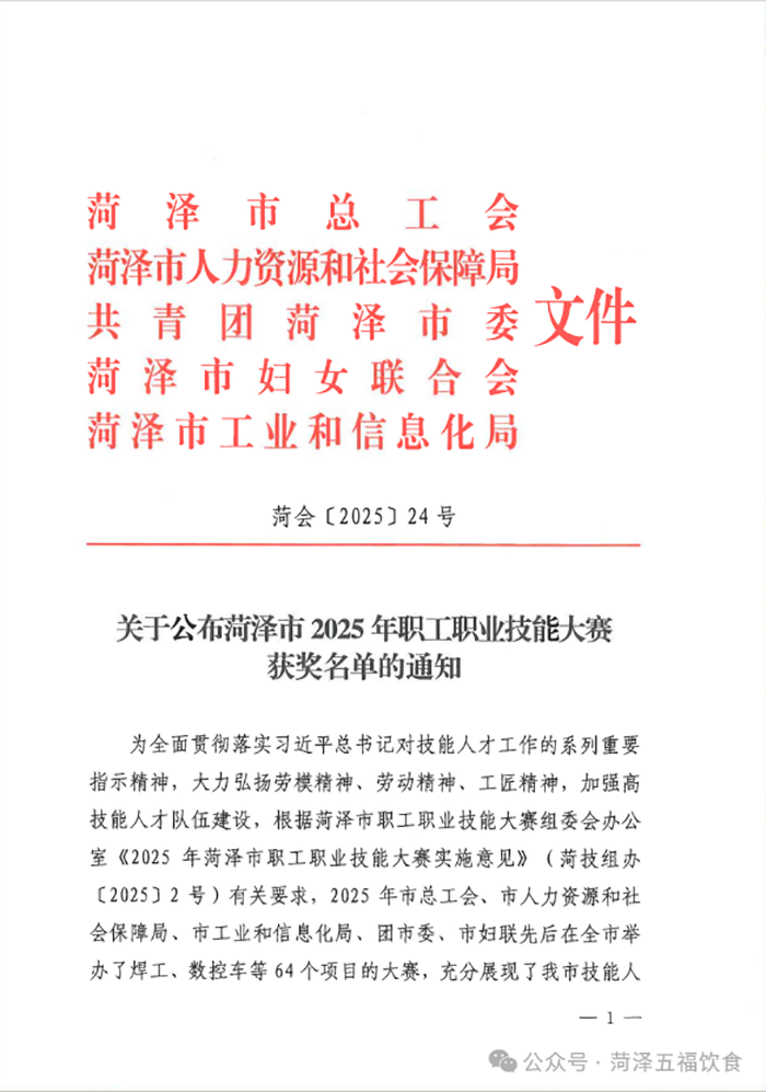 近日,菏泽市总工会、菏泽市人力资源和社会保障局、共青团菏泽市委、菏泽市妇女联合会、菏泽市工业和信息化局联合发文,正式公布 2025 年菏泽市职工职业技能大赛获奖名单。菏泽五福饮食有限公司多名员工凭借扎实的专业技能和出色的现场表现,在众多参赛者中脱颖而出,成功登上荣誉榜单,为公司赢得了荣誉!