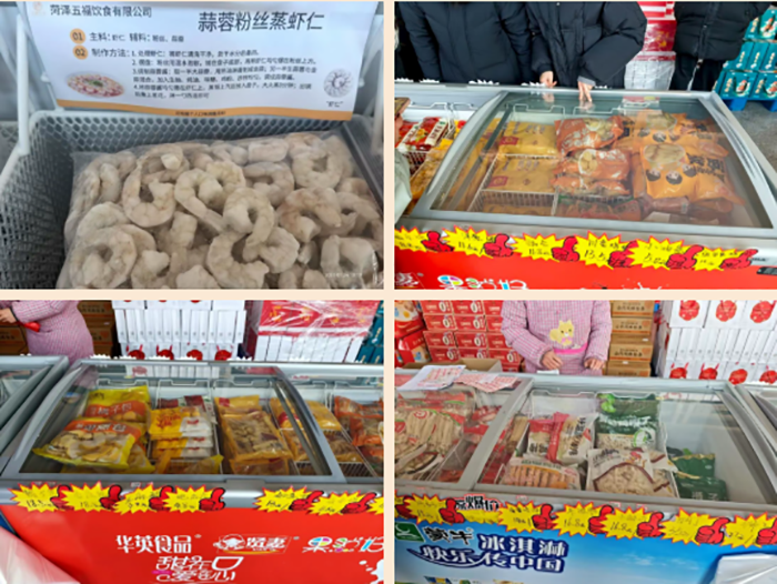 活动现场商品丰富、种类齐全。冷冻品区备受欢迎,大虾、虾仁、鸡柳、鸡排、小酥肉、香蕉包等各类半成品整齐陈列,特别贴心的是一些产品旁还配有精心设计的菜谱卡片,详细介绍了烹饪方法与搭配建议,让家庭主厨们能够轻松制作美味佳肴。