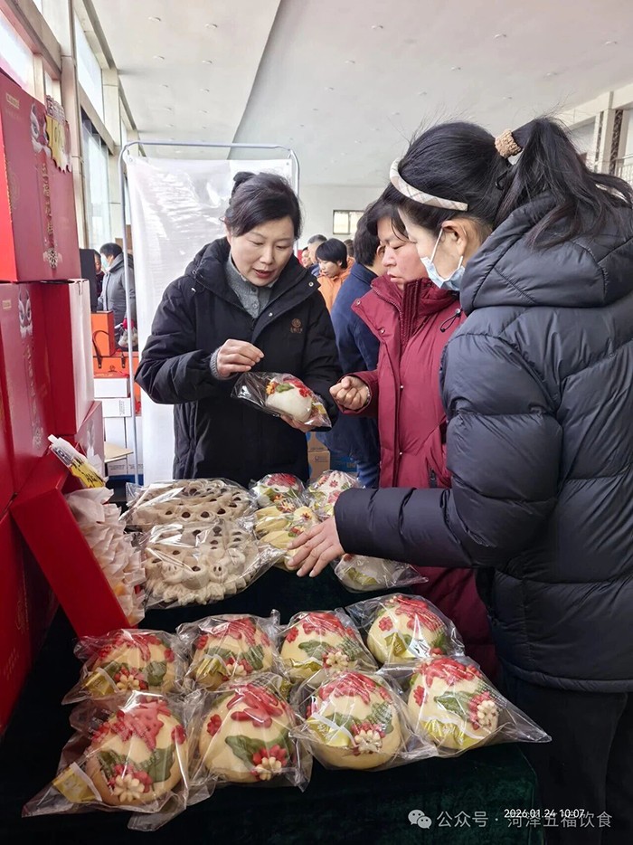 花糕礼盒预定区人头攒动,传统美食"灶爷山"花糕及造型各异的花馍展品成为全场焦点。象征吉祥如意的福袋造型、寓意年年有余的鲤鱼形态,每一件作品都融合了传统技艺与现代审美,展现着匠人们的巧思妙手。顾客们在这些精美面点前驻足端详,不时向工作人员询问预定流程。