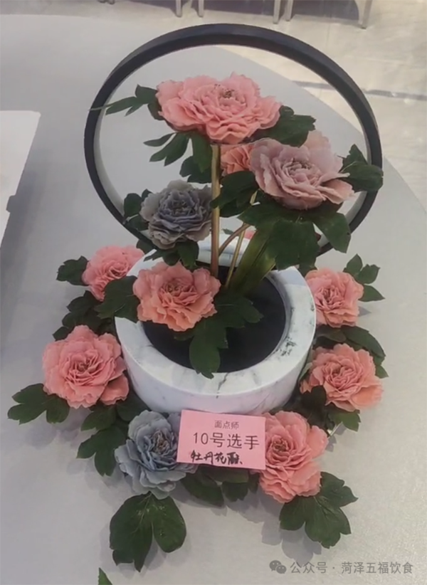 赛场之上,胡美华凭借精湛的面点技艺和对菏泽牡丹文化的深刻诠释,带来了《牡丹花酥》《曹州牡丹甲天下》两款匠心之作。作品造型精美逼真,将牡丹的雍容华贵展现得淋漓尽致,口感更是细腻醇厚、层次丰富,不仅征服了现场评委的味蕾,更赢得了一致好评。最终,胡美华一举斩获中式面点第一名的优异成绩,并荣获 “菏泽市职工职业技能大赛一等奖”,同时获得晋升中式面点师一级技师职业技能等级的资格!